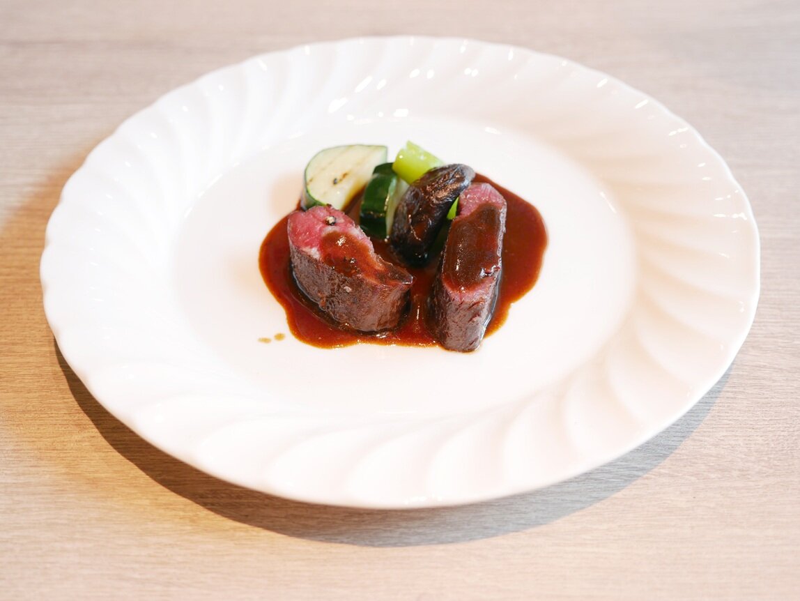 料理名:夏鹿と野菜のグリエ ジュ・ノワール(Chevreuil d'Été et Légumes Grillés, Jus Noir)